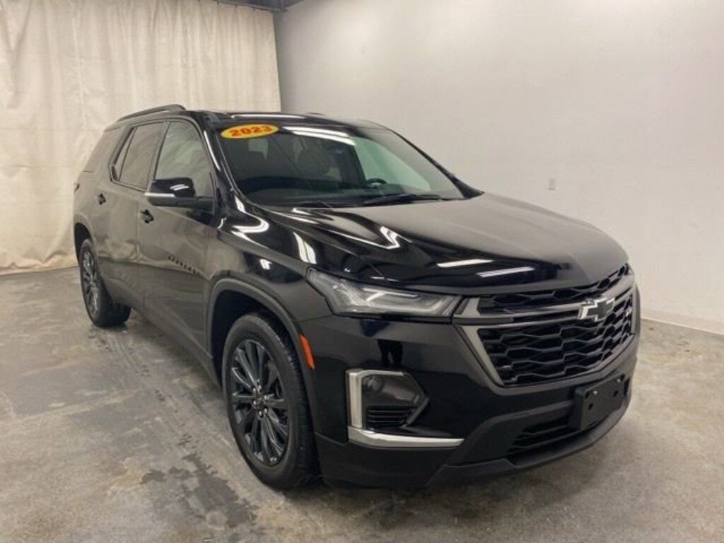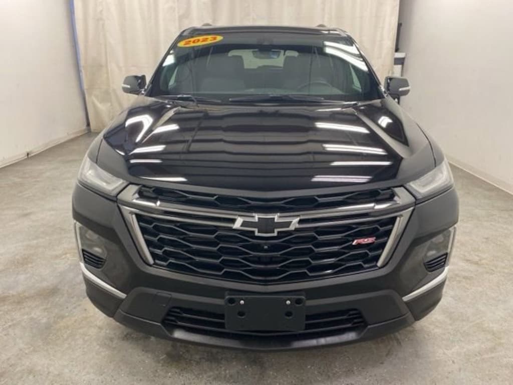 CARFAX One-Owner. Clean CARFAX. Certified. Black Metallic 2023 Chevrolet Traverse RS AWD 9-Speed Automatic 3.6L V6 SIDI VVT **ONE OWNER**, ** LOW MILES**, **GM CERTIFIED**, **ACCIDENT FREE**, Chevrolet Certified Pre-Owned Certified, AWD, 10 Speakers, 1st & 2nd Row All-Weather Floor Mats, 3.49 Axle Ratio, 3rd Row All-Weather Floor Mats, 3rd row seats: split-bench, 4-Wheel Disc Brakes, 6-Way Power Front Passenger Seat, 8-Way Power Driver Seat Adjuster, ABS brakes, Air Conditioning, All-Weather Cargo Mat (LPO), Alloy wheels, AM/FM radio: SiriusXM with 360L, Apple CarPlay/Android Auto, Auto High-beam Headlights, Auto-dimming Rear-View mirror, Automatic temperature control, Bose Premium 10-Speaker Audio System Feature, Brake assist, Bumpers: body-color, Compass, Delay-off headlights, Driver door bin, Driver vanity mirror, Dual front impact airbags, Dual front side impact airbags, Dual SkyScape 2-Panel Power Sunroof, Electronic Stability Control, Emergency communication system, Exterior Parking Camera Rear, Four wheel independent suspension, Front anti-roll bar, Front Bucket Seats, Front Center Armrest, Front dual zone A/C, Front License Plate Bracket Mounting Package, Front Passenger 2-Way Power Lumbar, Front reading lights, Fully automatic headlights, Garage door transmitter, Heated door mirrors, Heated Driver & Front Passenger Seats, Heated front seats, Heated steering wheel, Illuminated entry, Interior Protection Package (LPO), Leather steering wheel, Low tire pressure warning, Navigation System, Not Equipped w/Rear Park Assist (060), Occupant sensing airbag, Outside temperature display, Overhead airbag, Overhead console, Panic alarm, Passenger door bin, Passenger vanity mirror, Perforated Leather-Appointed Seat Trim, Power door mirrors, Power Driver Lumbar Control, Power driver seat, Power Liftgate, Power passenger seat, Power steering, Power windows, Preferred Equipment Group 2LT, Premium audio system: Chevrolet Infotainment 3 Plus, Radio data system, Radio: Chevrolet Infotainment 3 Plus System w/Navi, Rear air conditioning, Rear anti-roll bar, Rear reading lights, Rear window defroster, Rear window wiper, Remote keyless entry, Security system, SiriusXM w/360L, Speed control, Speed-sensing steering, Spoiler, Steering wheel mounted audio controls, Tachometer, Telescoping steering wheel, Tilt steering wheel, Traction control, Trip computer, Turn signal indicator mirrors, Variably intermittent wipers, Voltmeter, Wheels: 20 Dark Aluminum, AWD.