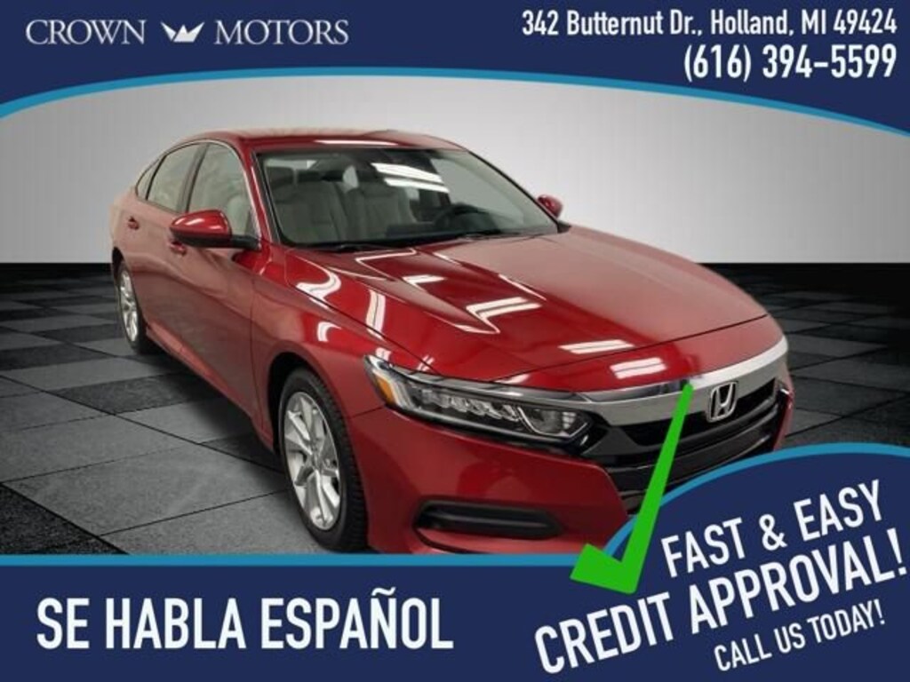 CARFAX One-Owner. Clean CARFAX. Red 2018 Honda Accord LX FWD CVT 1.5T I4 DOHC 16V Turbocharged VTEC Ivory Cloth, 4 Speakers, 4-Wheel Disc Brakes, ABS brakes, Air Conditioning, Alloy wheels, AM/FM radio, Auto High-beam Headlights, Automatic temperature control, Brake assist, Bumpers: body-color, Cloth Seat Trim, Delay-off headlights, Driver door bin, Driver vanity mirror, Dual front impact airbags, Dual front side impact airbags, Electronic Stability Control, Exterior Parking Camera Rear, Four wheel independent suspension, Front anti-roll bar, Front Bucket Seats, Front Center Armrest, Front dual zone A/C, Front reading lights, Fully automatic headlights, Illuminated entry, Knee airbag, Low tire pressure warning, Occupant sensing airbag, Outside temperature display, Overhead airbag, Overhead console, Panic alarm, Passenger door bin, Passenger vanity mirror, Power door mirrors, Power steering, Power windows, Radio data system, Radio: 160-Watt AM/FM Audio System, Rear anti-roll bar, Rear seat center armrest, Rear window defroster, Remote keyless entry, Security system, Speed control, Speed-sensing steering, Speed-Sensitive Wipers, Steering wheel mounted audio controls, Tachometer, Telescoping steering wheel, Tilt steering wheel, Traction control, Trip computer, Variably intermittent wipers, Wheels: 17" Silver-Painted Alloy, Ivory Cloth.
