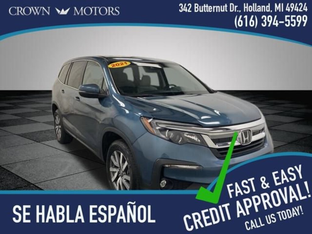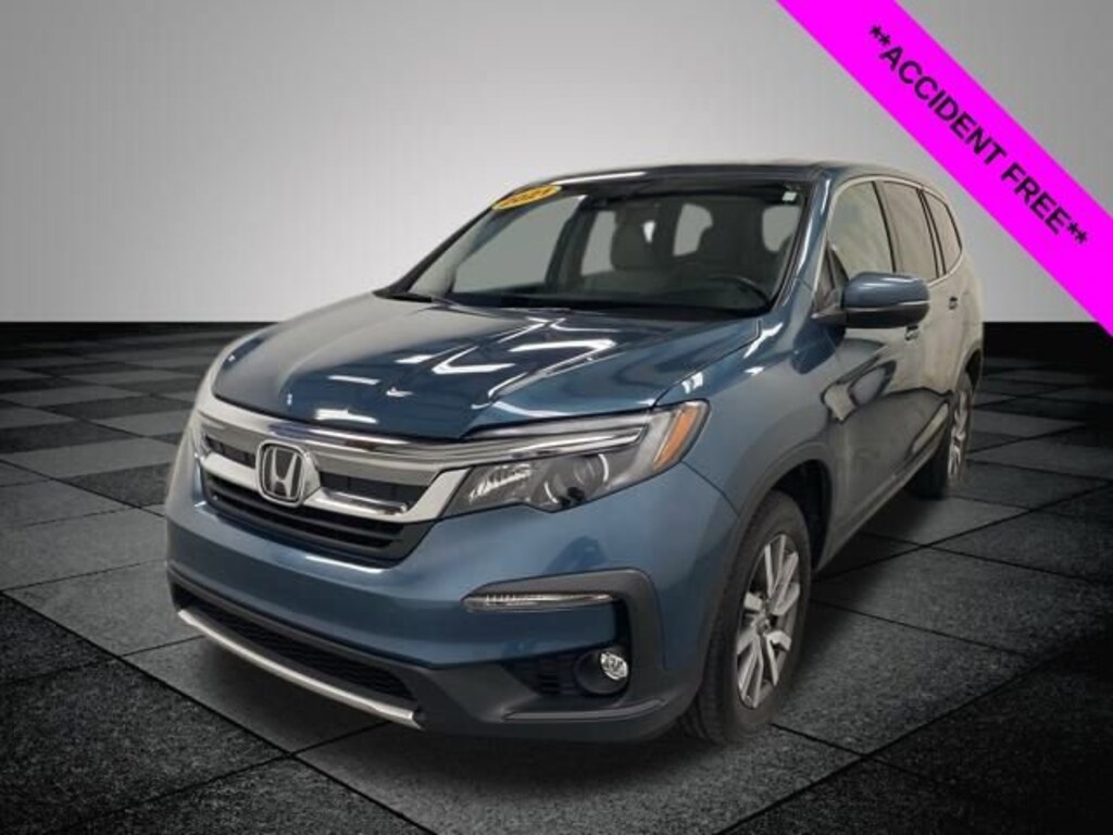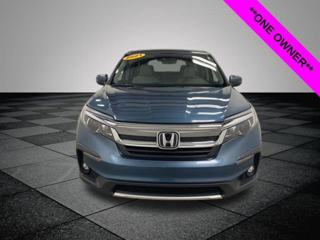 CARFAX One-Owner. Clean CARFAX. Steel Sapphire Metallic 2021 Honda Pilot EX-L AWD 9-Speed Automatic 3.5L V6 24V SOHC i-VTEC **ONE OWNER**, **ACCIDENT FREE**, **LOCAL TRADE IN**, AWD, 18" Machine-Finished Alloy Wheels, 3rd row seats: split-bench, 4-Wheel Disc Brakes, 4.33 Axle Ratio, 7 Speakers, A/V remote: CabinControl, ABS brakes, Air Conditioning, Alloy wheels, AM/FM radio: SiriusXM, Apple CarPlay/Android Auto, Auto High-beam Headlights, Auto-dimming Rear-View mirror, Automatic temperature control, Blind Spot Information (BSI) System warning, Brake assist, Bumpers: body-color, Delay-off headlights, Driver door bin, Driver vanity mirror, Dual front impact airbags, Dual front side impact airbags, Electronic Stability Control, Emergency communication system: HondaLink Assist, Exterior Parking Camera Rear, Forward collision: Collision Mitigation Braking System (CMBS) + FCW mitigation, Four wheel independent suspension, Front anti-roll bar, Front Bucket Seats, Front Center Armrest, Front dual zone A/C, Front fog lights, Front reading lights, Fully automatic headlights, Garage door transmitter: HomeLink, Heated door mirrors, Heated Front Bucket Seats, Heated front seats, Illuminated entry, Lane departure: Lane Keeping Assist System (LKAS) active, Leather Seat Trim, Low tire pressure warning, Memory seat, Occupant sensing airbag, Outside temperature display, Overhead airbag, Overhead console, Panic alarm, Passenger door bin, Passenger vanity mirror, Power door mirrors, Power driver seat, Power Liftgate, Power moonroof, Power passenger seat, Power steering, Power windows, Radio data system, Radio: 215-Watt Audio System, Rear air conditioning, Rear anti-roll bar, Rear reading lights, Rear seat center armrest, Rear window defroster, Rear window wiper, Reclining 3rd row seat, Remote keyless entry, Security system, Speed control, Speed-sensing steering, Speed-Sensitive Wipers, Split folding rear seat, Spoiler, Steering wheel mounted audio controls, Tachometer, Telescoping steering wheel, Tilt steering wheel, Traction control, Trip computer, Turn signal indicator mirrors, Variably intermittent wipers, AWD.