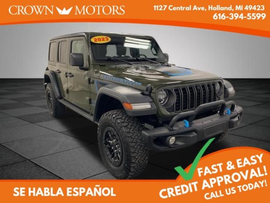 CARFAX One-Owner. Clean CARFAX. Sarge Green Clearcoat 2023 Jeep Wrangler Rubicon 20th Anniversary Edition 4xe 4WD 8-Speed Automatic 2.0L I4 DOHC 2.0L I4 DOHC, #1 Seat Foam Cushion, 20th Anniversary Rubicon 4xe Suspension, Corning Gorilla Glass, Integrated Off-Road Camera, Leather Wrapped Park Brake Handle, Leather Wrapped Shift Knob, MOPAR 3 Bar Bumper Hoop, MOPAR All-Weather Floor Mats, MOPAR Rubicon 20th Anniversary Tool Kit, Nappa Leather Seats, Navigation System, Premium Door Trim Panel, Premium Wrapped Red I/P Bezels, Quick Order Package 29T Rubicon 20th Anniversary, Red Interior Accents, Red Seat Belt, Rubicon 20th Anniversary, Rubicon 20th Anniversary Grille, Rubicon 20th Anniversary Shifter Medallion, Rubicon 20th Anniversary Side Hood Decal 4xe, Rubicon 20th Anniversary Swing Gate Plaque, Rubicon 20th Anniversary Top Hood Decal 4xe, Steel Bumper Group, Trailer Tow & Aux Switch Group, Wheels: 17" x 7.5" Black Beadlock Capable, 4-Wheel Disc Brakes, 4.10 Rear Axle Ratio, 7 & 4 Pin Wiring Harness, 700 Amp Maintenance Free Battery, 9 Speakers, ABS brakes, Air Conditioning, Alloy wheels, AM/FM radio: SiriusXM, Apple CarPlay/Android Auto, Auto-dimming Rear-View mirror, Automatic temperature control, Auxiliary Switches, Black 3-Piece Hard Top, Brake assist, Class II Receiver Hitch, Compass, Delay-off headlights, Driver door bin, Driver vanity mirror, Dual front impact airbags, Dual front side impact airbags, Electronic Stability Control, Emergency communication system: SiriusXM Guardian, Freedom Panel Storage Bag, Front anti-roll bar, Front Bucket Seats, Front Center Armrest w/Storage, Front dual zone A/C, Front fog lights, Front reading lights, Fully automatic headlights, Garage door transmitter, Heated door mirrors, Illuminated entry, Integrated roll-over protection, Jeep Trail Rated Kit, Low tire pressure warning, Manufacturer's Statement of Origin, Occupant sensing airbag, Outside temperature display, Panic alarm, ParkView Rear Back-Up Camera, Passenger door bin, Passenger vanity mirror, Performance Suspension, Power door mirrors, Power steering, Power windows, Premium Cloth Low-Back Bucket Seats, Radio data system, Radio: Uconnect 4C Nav w/8.4" Display, Rear anti-roll bar, Rear reading lights, Rear Window Defroster, Rear Window Wiper/Washer, Remote keyless entry, Security system, Speed control, Split folding rear seat, Steel Front Bumper, Steel Rear Bumper, Steering wheel mounted audio controls, Tachometer, Telescoping steering wheel, Tilt steering wheel, Traction control, Trip computer, Variably intermittent wipers, Voltmeter, Wheels: 17" x 7.5" Machined w/Black Pockets, **Bluetooth**, **Leather**, **Rear Back Up Camera**, 2.0L I4 DOHC, #1 Seat Foam Cushion, 20th Anniversary Rubicon 4xe Suspension, Corning Gorilla Glass, Integrated Off-Road Camera, Leather Wrapped Park Brake Handle, Leather Wrapped Shift Knob, MOPAR 3 Bar Bumper Hoop, MOPAR All-Weather Floor Mats, MOPAR Rubicon 20th Anniversary Tool Kit, Nappa Leather Seats, Navigation System, Premium Door Trim Panel, Premium Wrapped Red I/P Bezels, Quick Order Package 29T Rubicon 20th Anniversary, Red Interior Accents, Red Seat Belt, Rubicon 20th Anniversary, Rubicon 20th Anniversary Grille, Rubicon 20th Anniversary Shifter Medallion, Rubicon 20th Anniversary Side Hood Decal 4xe, Rubicon 20th Anniversary Swing Gate Plaque, Rubicon 20th Anniversary Top Hood Decal 4xe, Steel Bumper Group, Trailer Tow & Aux Switch Group, Wheels: 17" x 7.5" Black Beadlock Capable.