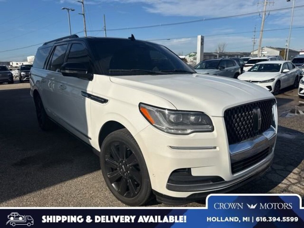 28 Speakers, 3.73 Axle Ratio, 3rd row seats: split-bench, 4-Wheel Disc Brakes, ABS brakes, Active Park Assist 2.0 Prep Kit, Adaptive suspension, Adjustable pedals, Air Conditioning, Alloy wheels, AM/FM radio: SiriusXM with 360L, Audio memory, Auto High-beam Headlights, Auto Start-Stop Technology, Auto tilt-away steering wheel, Auto-dimming door mirrors, Auto-dimming Rear-View mirror, Auto-leveling suspension, Automatic temperature control, Black Label Special Edition Package, Black Painted Cap Sideview Mirror, Black Painted Roof, Black Painted Roof Rack, Bodyside moldings, Brake assist, Bumpers: body-color, Compass, Delay-off headlights, Driver door bin, Driver vanity mirror, Driver's Seat Mounted Armrest, Dual front impact airbags, Dual front side impact airbags, Electronic Stability Control, Emergency communication system: 911 Assist, Equipment Group 800A Black Label, Exterior Parking Camera Rear, Four wheel independent suspension, Front anti-roll bar, Front Bucket Seats, Front dual zone A/C, Front fog lights, Front reading lights, Fully automatic headlights, Garage door transmitter, Genuine wood console insert, Genuine wood door panel insert, Hands-Free Liftgate Delete, Head restraints memory, Heads-Up Display, Heated door mirrors, Heated front seats, Heated rear seats, Heated steering wheel, HVAC memory, Illuminated entry, Leather steering wheel, Lincoln Star Hub Wheel Ornament, Low tire pressure warning, Memory seat, Navigation system: Connected Navigation (3-year trial), Occupant sensing airbag, Outside temperature display, Overhead airbag, Overhead console, Panic alarm, Passenger door bin, Passenger seat mounted armrest, Passenger vanity mirror, Pedal memory, Power adjustable front head restraints, Power adjustable rear head restraints, Power door mirrors, Power driver seat, Power Liftgate, Power moonroof: Panoramic Vista Roof, Power passenger seat, Power steering, Power windows, Radio data system, Radio: Revel Ultima 3D AM/FM/HD/MP3 Audio System, Rain sensing wipers, Rear air conditioning, Rear anti-roll bar, Rear audio controls, Rear reading lights, Rear window defroster, Rear window wiper, Reclining 3rd row seat, Remote keyless entry, Security system, SiriusXM w/360L, Speed control, Speed-sensing steering, Speed-Sensitive Wipers, Split folding rear seat, Spoiler, Steering wheel memory, Steering wheel mounted audio controls, SYNC 4 Communications & Entertainment System, Tachometer, Telescoping steering wheel, Tilt steering wheel, Traction control, Trip computer, Turn signal indicator mirrors, Unique Chrome Surround Grille, Variably intermittent wipers, Venetian Lthr Auto Htd/Ventilatd Capt's Chairs (B), Ventilated front seats, Ventilated rear seats, Voice-Activated Touchscreen Navigation System, Wheels: 22" 14-Spoke Bright Machined Aluminum, Wheels: 22" Black Aluminum.
