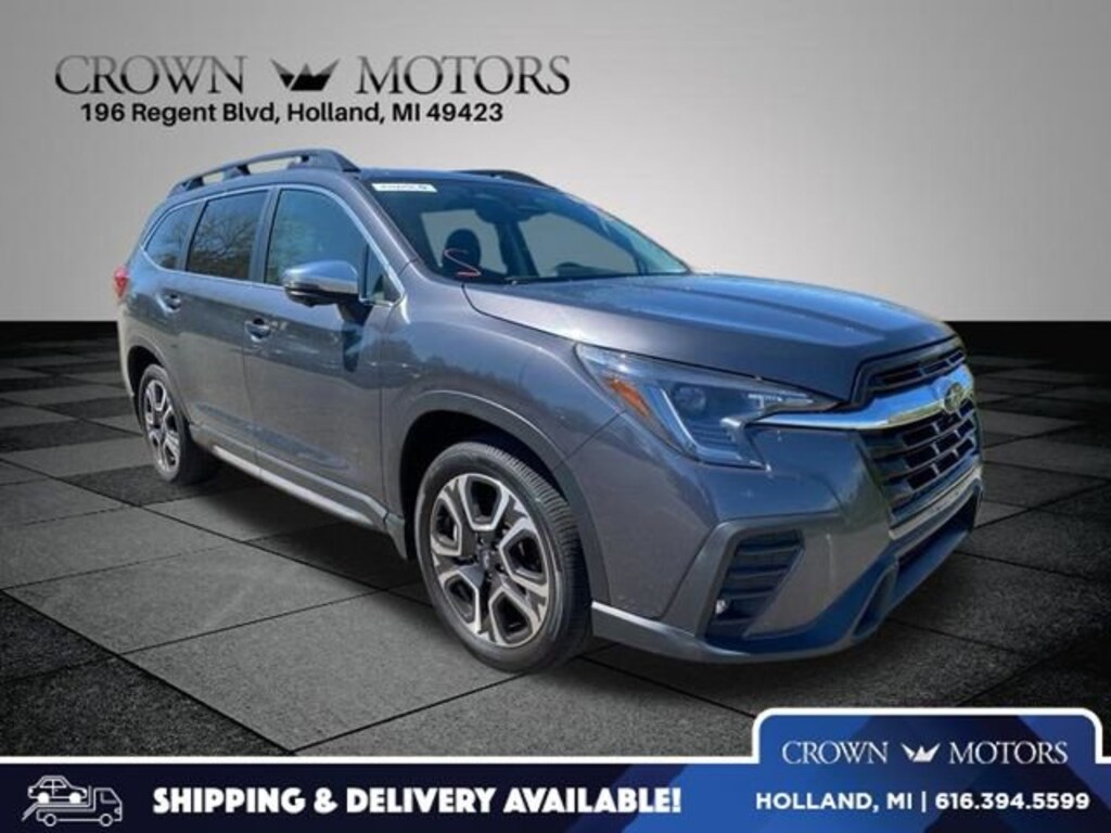 CARFAX One-Owner. Clean CARFAX. Gray Metallic 2023 Subaru Ascent Limited AWD Lineartronic CVT 2.4L 4-Cylinder DOHC 16V 3rd row seats: bench, 4-Wheel Disc Brakes, 6 Speakers, ABS brakes, Air Conditioning, All-Weather Floor Liners, Alloy wheels, AM/FM radio: SiriusXM, Auto High-beam Headlights, Auto-Dimming Exterior Mirror w/Approach Light, Auto-dimming Rear-View mirror, Automatic temperature control, Axle Ratio: 4.44, Brake assist, Bumpers: body-color, Cabin Connect, Cargo Tray, Delay-off headlights, Driver door bin, Driver vanity mirror, Dual front impact airbags, Dual front side impact airbags, Electronic Stability Control, Emergency communication system: STARLINK Safety and Security (Subscription Required), Exterior Parking Camera Rear, Four wheel independent suspension, Front anti-roll bar, Front Bucket Seats, Front Center Armrest, Front dual zone A/C, Front fog lights, Front reading lights, Fully automatic headlights, Garage door transmitter: HomeLink, Heated door mirrors, Heated Front Bucket Seats, Heated front seats, Heated rear seats, Heated steering wheel, HVAC memory, Illuminated entry, Knee airbag, Leather Shift Knob, Leather steering wheel, Low tire pressure warning, Map & Reading Lights LED Upgrade - 6 Bulb Kit, Memory seat, Occupant sensing airbag, Outside temperature display, Overhead airbag, Overhead console, Panic alarm, Panoramic Power Moonroof w/UV/Drk Tint Dual Glass, Passenger door bin, Passenger vanity mirror, Perforated Leather-Trimmed Upholstery, Power door mirrors, Power driver seat, Power Liftgate, Power passenger seat, Power steering, Power windows, Radio data system, Radio: Subaru STARLINK 11.6 Multimedia Nav System, Radio: Subaru STARLINK 11.6 Multimedia Plus System, Rear air conditioning, Rear anti-roll bar, Rear Bumper Cover, Rear reading lights, Rear window defroster, Rear window wiper, Reclining 3rd row seat, Remote keyless entry, Retractable Cargo Area Cover, Satin Chrome Power-Folding Exterior Power Mirrors, Security system, Speed control, Speed-sensing steering, Splash Guards, Split folding rear seat, Spoiler, STARLINK/Apple CarPlay/Android Auto, Steering wheel mounted audio controls, Surround View Monitor System, Tachometer, Technology Package, Telescoping steering wheel, Tilt steering wheel, Traction control, Trip computer, Turn signal indicator mirrors, USB Charging Ports, Variably intermittent wipers, Wheels: 20 x 7.5 J Dk Gray Alloy w/Machine Finish.Recent Arrival! Odometer is 10820 miles below market average!Call us today for a test drive at 1-616-394-5599 or for a quick question TEXT 616-499-2225. Feel free to click on the Carfax. It is FREE! Customer Satisfaction Comes First Award-Winning Service Department Family-Owned and Community-Focused As a local business, we proudly support West Michigan schools, charities, and organizations, including Holland Public Schools, Zeeland Schools, Hope College, Evergreen Commons, and many more. No Gimmicks, No Hidden Fees Crown Motors provides straightforward, transparent pricing. Convenient Online Shopping Apply for financing, get a trade-in evaluation, and browse our inventory from home. Our online team is available to assist you every step of the way. Decades of Experience With over 25 years in business, we have the expertise to handle any situation and help you find the right vehicle. Customer Convenience Comes First we offer a play area for kids, and many modern amenities. Proven Customer Satisfaction Don't just take our word for it-see what our customers have to say about their experience at Crown Motors.