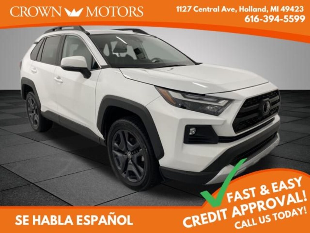 Clean CARFAX. Ice 2024 Toyota RAV4 Adventure AWD 8-Speed Automatic 2.5L 4-Cylinder DOHC Dual VVT-i **ALL WHEEL DRIVE**, **BLIND SPOT MONITOR**, **Dual Zone Automatic Climate Control**, **LEATHER SEATS**, **REAR VIEW CAMERA**, **SAFETY SENSE TECHNOLOGY**, AWD, Black Artificial Leather, 19" Split 5-Spoke Alloy Wheels, 4-Wheel Disc Brakes, 6 Speakers, ABS brakes, Air Conditioning, Alloy wheels, AM/FM radio: SiriusXM, Auto High-beam Headlights, Automatic temperature control, Axle Ratio: 3.177, Brake assist, Bumpers: body-color, Delay-off headlights, Driver door bin, Driver vanity mirror, Dual front impact airbags, Dual front side impact airbags, Electronic Stability Control, Emergency communication system: Safety Connect (10-year trial), Exterior Parking Camera Rear, Four wheel independent suspension, Front anti-roll bar, Front Bucket Seats, Front Center Armrest, Front dual zone A/C, Front fog lights, Front reading lights, Fully automatic headlights, Heated door mirrors, Illuminated entry, Knee airbag, Leather Shift Knob, Leather steering wheel, Low tire pressure warning, Occupant sensing airbag, Outside temperature display, Overhead airbag, Overhead console, Panic alarm, Passenger door bin, Passenger vanity mirror, Power door mirrors, Power driver seat, Power steering, Power windows, Radio data system, Radio: AM/FM/XM Audio System, Rear anti-roll bar, Rear seat center armrest, Rear window defroster, Rear window wiper, Remote keyless entry, Security system, SofTex Seat Trim, Speed control, Speed-sensing steering, Split folding rear seat, Spoiler, Steering wheel mounted audio controls, Tachometer, Telescoping steering wheel, Tilt steering wheel, Traction control, Trip computer, Turn signal indicator mirrors, Variably intermittent wipers, **TOYOTA GOLD CERTIFIED**, **APPLE CAR PLAY/ANDROID AUTO CAPABLE**, **FREE CARFAX AT CROWNMOTORS.COM**, AWD, Black Artificial Leather.
